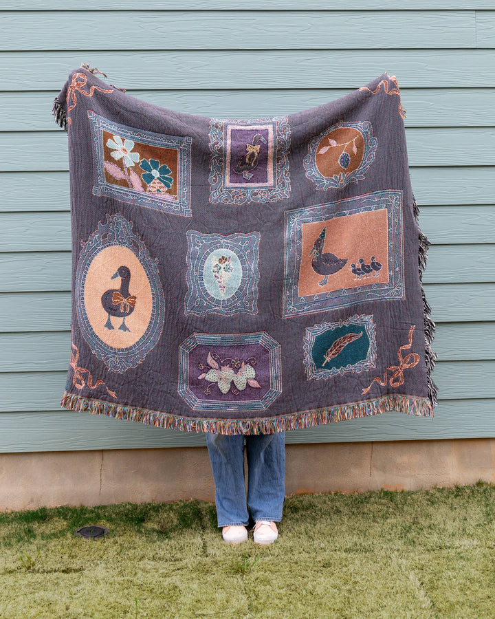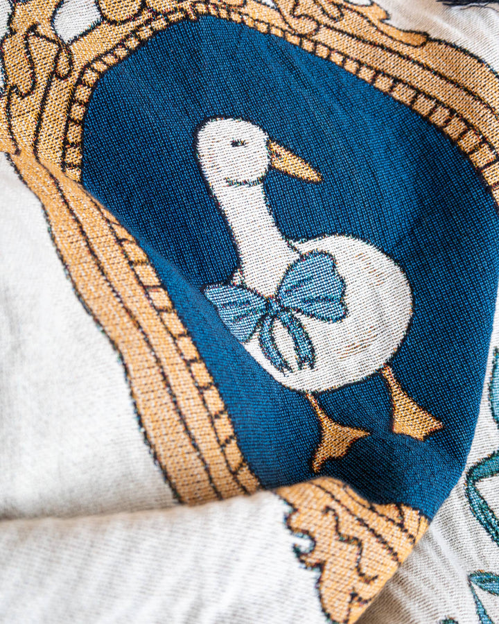 Chanel vintage vibes with the Lucky Duck Blanket. The artwork is inspired by vintage goose art and picture frames and created by Lindy. Each throw is woven on a jacquard loom here in North Carolina using 100% cotton yarns.