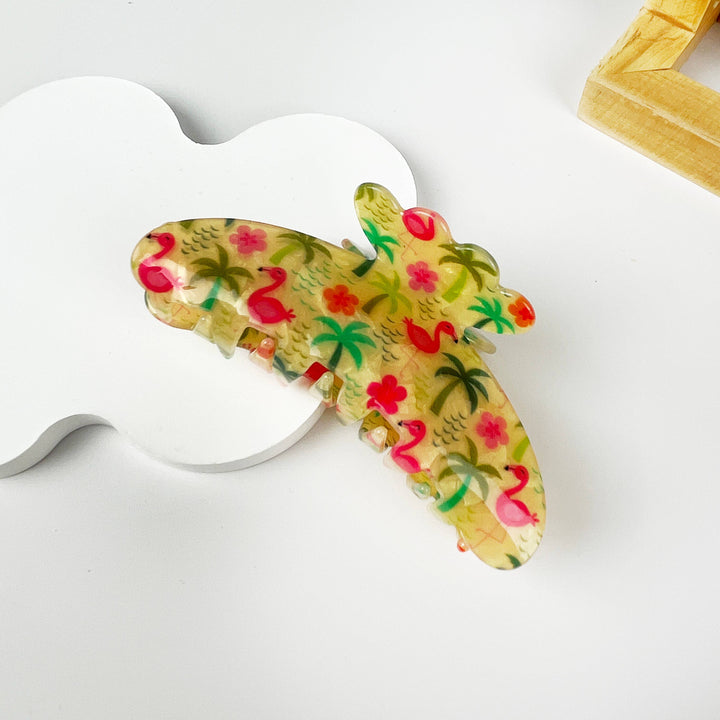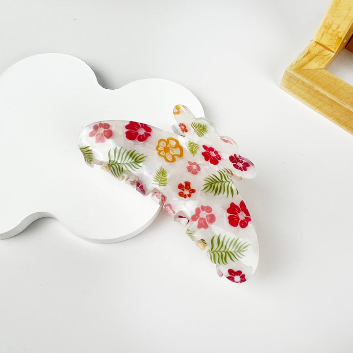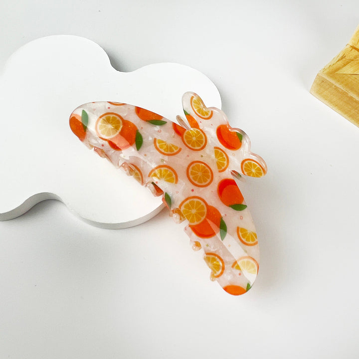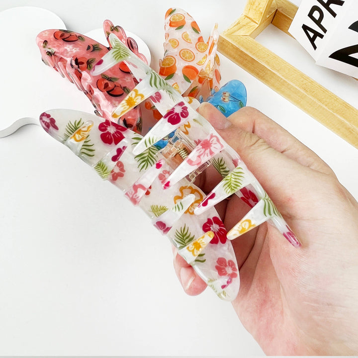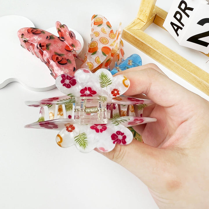 Crafted to make a statement, this oversized hair claw clip features a stunning array of colorful prints, including vivid flowers and cheerful fruit designs. The large size not only makes it a striking accessory but also ensures it can hold even the thickest of hair securely in place. Whether you're looking to add a pop of color to your everyday look or want a fun accessory for a special occasion, this clip is the perfect choice.