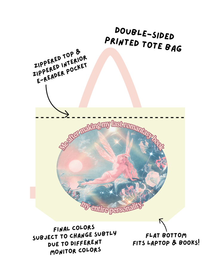 This product listing is for the bag shown in the mock up image! The last 3 images are for reference & example only of a previous bag design. The bag you will receive is the "Romantasy Book" design.